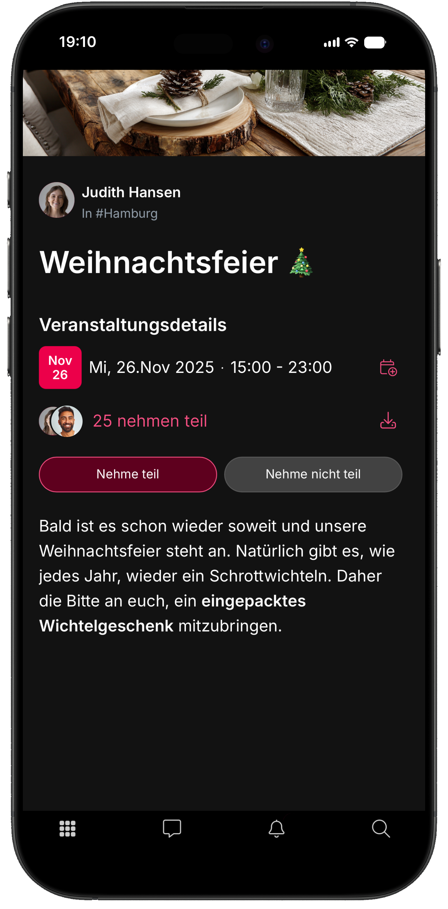 Just Social bietet dir News, Chat, Umfragen, Events, Wiki, Dateien und vieles mehr. Auf dem personalisierbaren Homescreen kannst du all deine weiteren Tools und Links nahtlos und integrieren. Endlich hast du alles an einem Ort, in einer App. Nice.